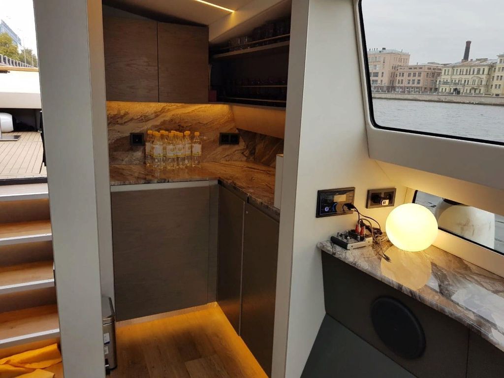 Стильный дизайн, особенная впечатляющая форма, плавный ход, мощные двигатели, эксклюзивная отделка — отличительные черты катера премиум класса. Прогулка по рекам и каналам на катере-яхте Амстердам станет особенным событием. На борт катера можно заказать банкет или фуршет.