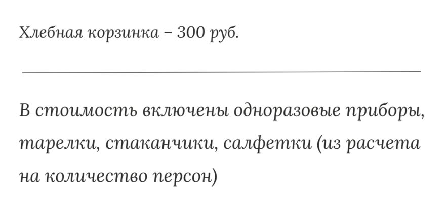 На вашу яхту можно заказать еду, закуски. Минимальный заказ на 2000 руб.. При заказе до 5000 руб. доставка стоит 500 руб.. В стоимость включены качественные одноразовые приборы, тарелки, стаканчики, салфетки. Количество персон необходимо сообщить при вашем заказе.